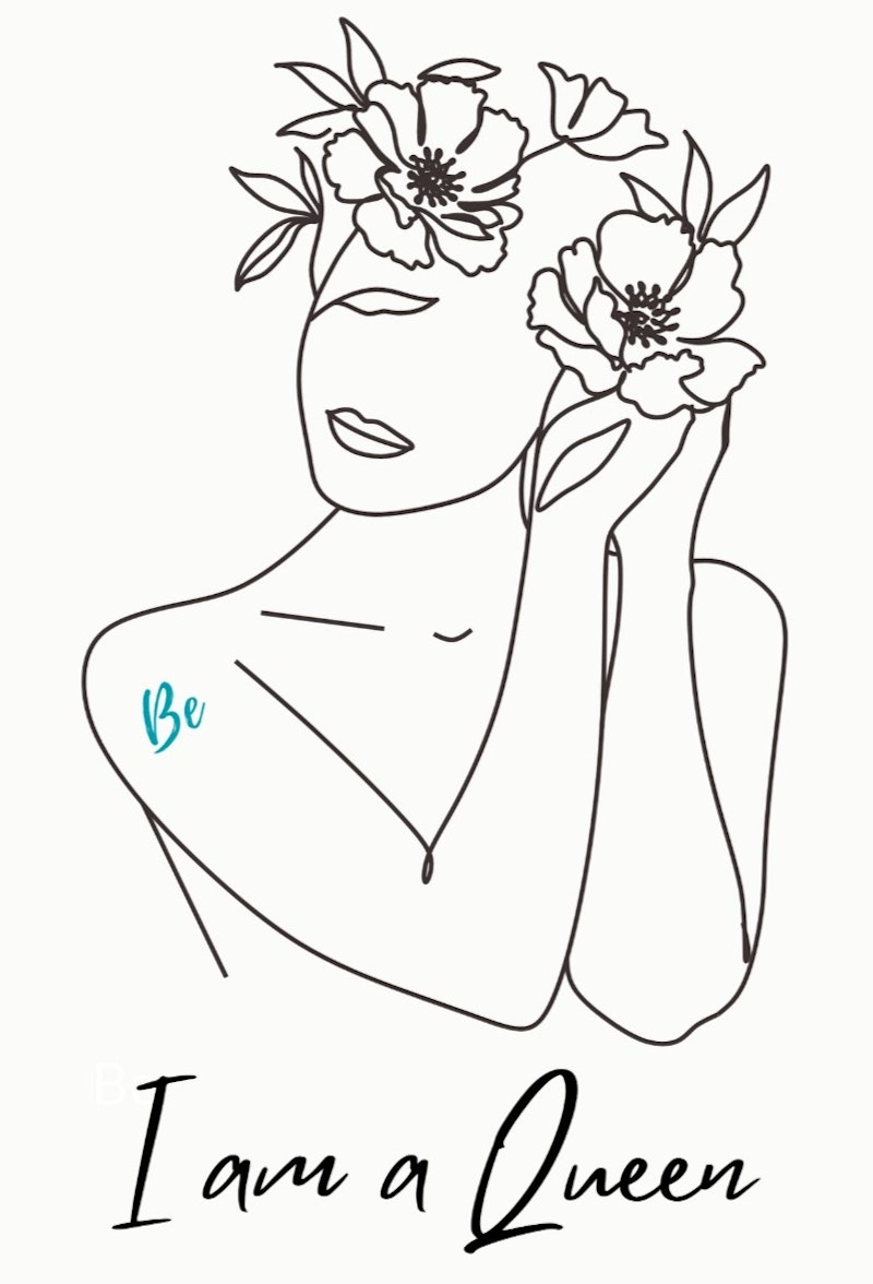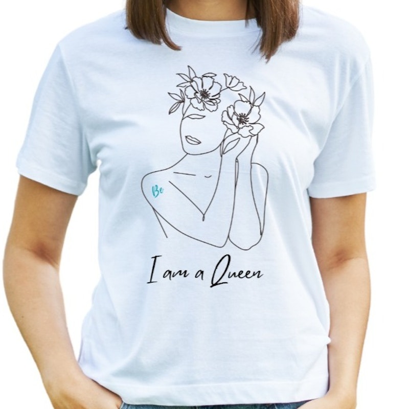 A soft style, female designed, jersey knit tee featuring a chic modern female silhouette line graphic adorning with a floral crown. Includes "I Am A Queen" text, Be tattoo and features a small exclusive Befitment brand logo graphic exclusively in gold on back.